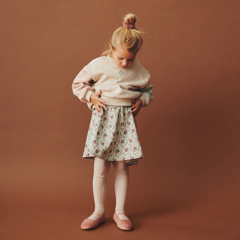 Mykt barneskjørt i økologisk bomull med søtt print. Over-kne-lengde, justerbar elastikk og rynker gir komfort og volum. Perfekt til både hverdags og fest. GOTS- og OEKO-TEX®-sertifisert. 95% bomull og 5% elastan. Tilgjengelig i flere størrelser