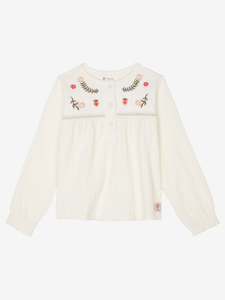 La jenta di skinne i den trendy Neodesha blusen fra Noppies! Den stilige, tidløse modellen passer like godt til skjørt som til jeans og er et must i barnegarderoben.