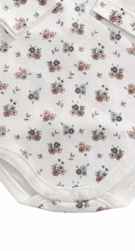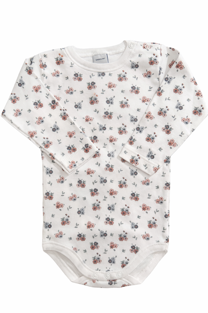 Nydelig body fra Babidu med blomstrete helprint. 100% myk bomull. Trykknapper mellom beina og på den ene skulderen.