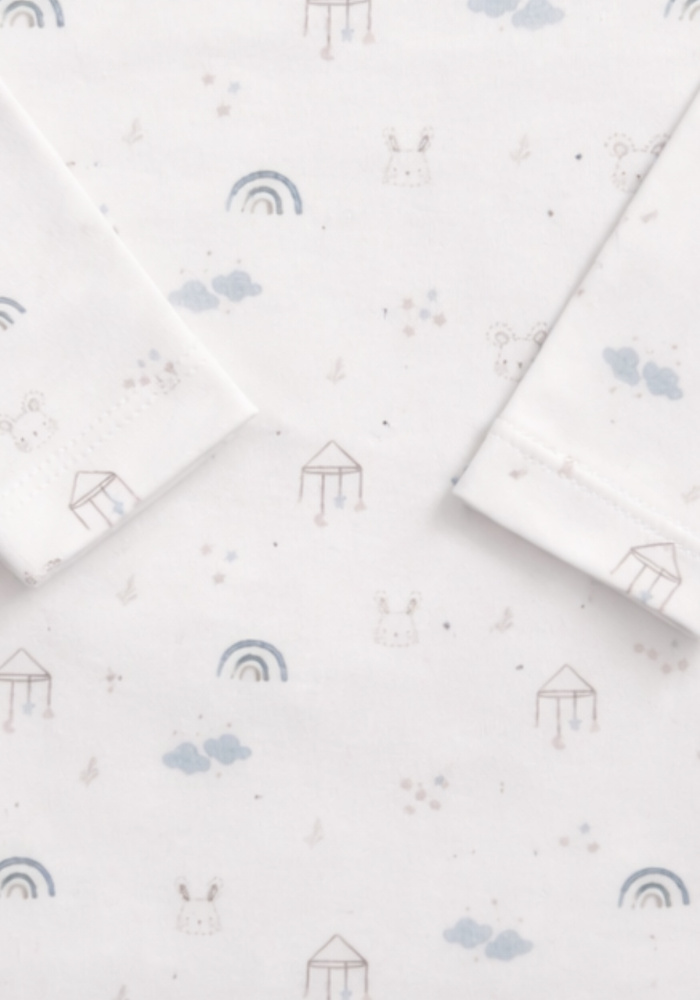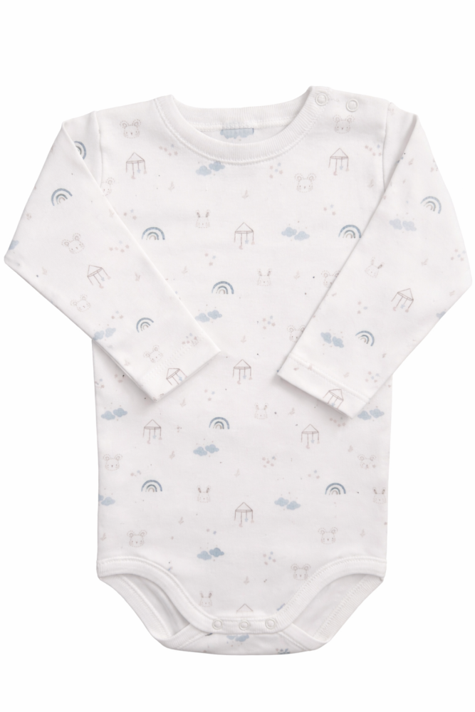 Nydelig body fra Babidu med helprint av skyer, kaniner og stjerner. 100% myk bomull. Trykknapper mellom beina og på den ene skulderen.