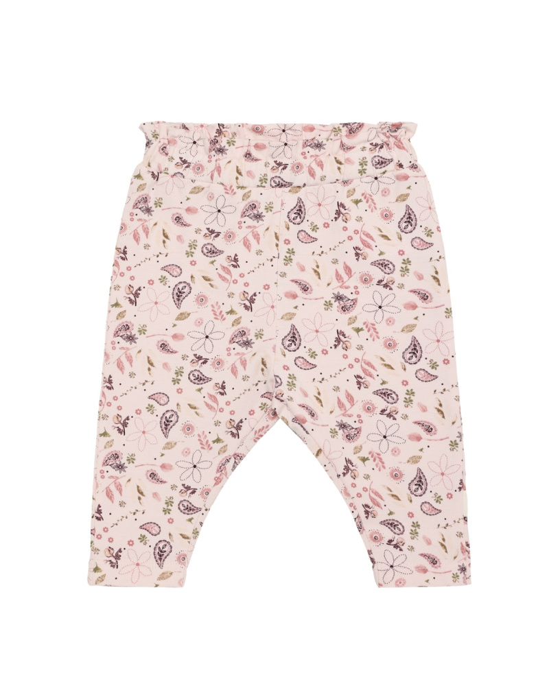 Bukse i deilig og mykt stoff med helprint. Rosa bunnfarge. Løs passform og elastisk strikk i livet. 95% bomull og 5% elastan