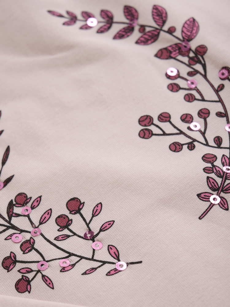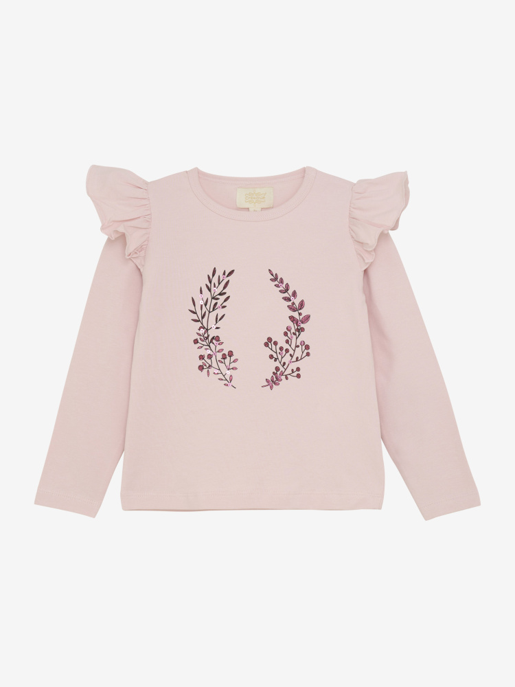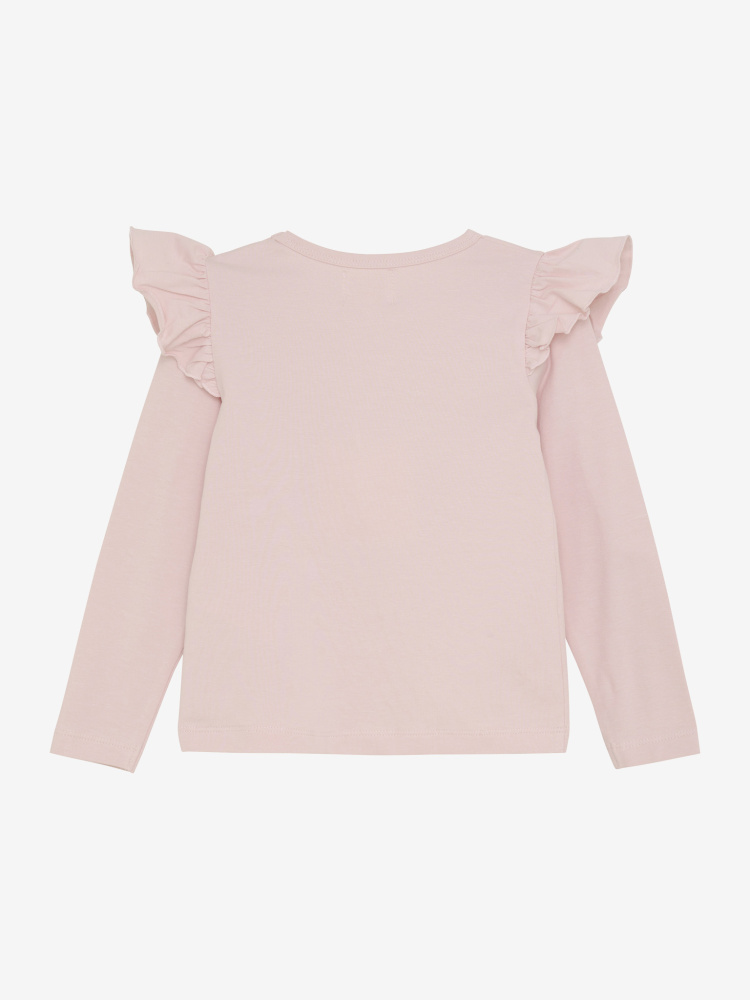 Langermet genser fra cremie. Rosa bunnfarge med print og paljetter i front. Volanger langs skuldrene gir et feminint uttrykk. 95% bomull og 5% elastan.