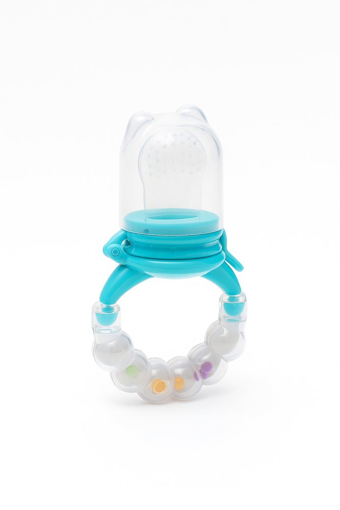 Fruktsmokk i blå farge med lokk og innebygd rangle i håndtaket. Kan vaskes i maskinen eller kokes. BPA-fri og 100% matgradsilikon