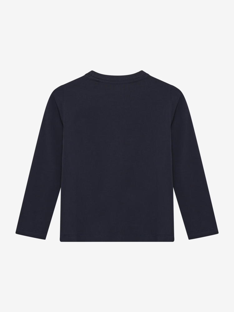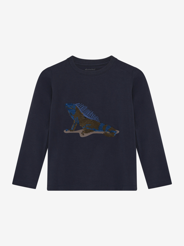 Langermet genser med blå bunnfarge. Øgle i front med paljetter. Lagd i deilig og bevegelig bomullsstoff. 95% bomull og 5% elastan