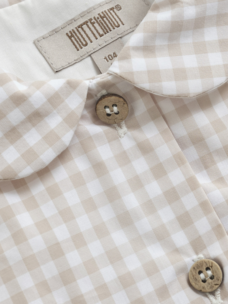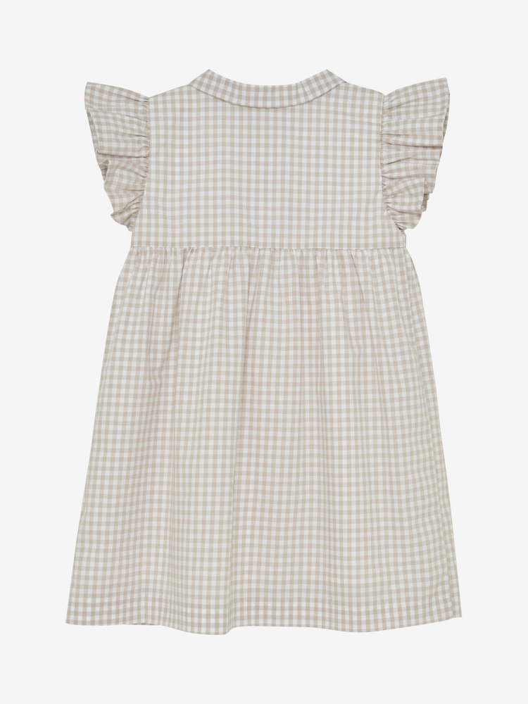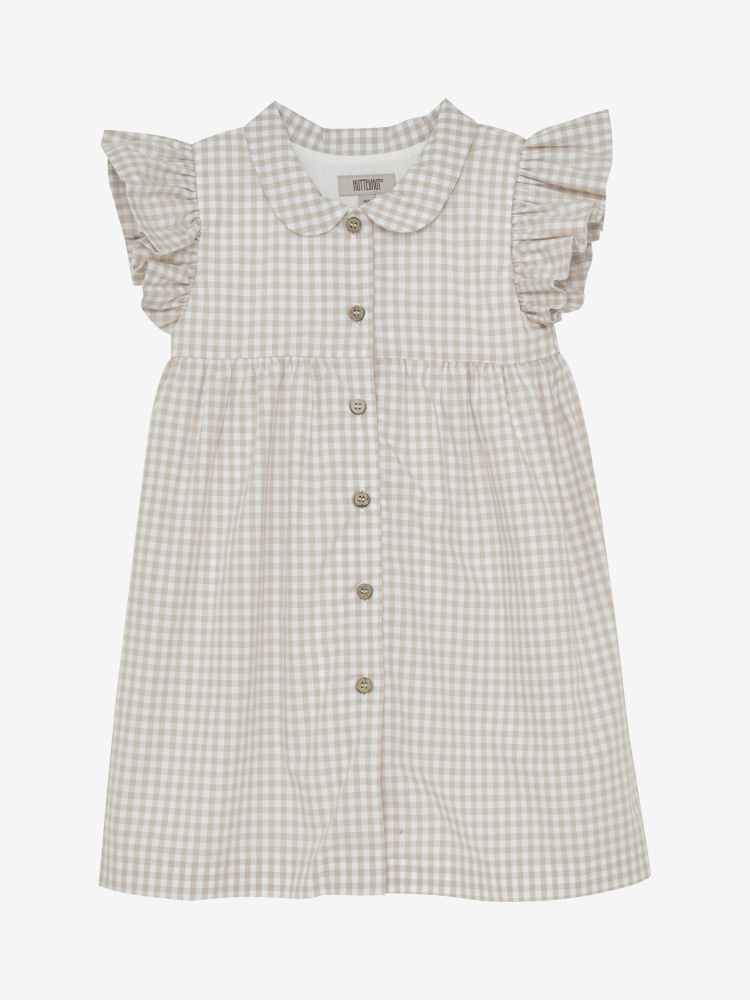 Søt og komfortabel sommerkjole fra HUTTEliHUT i myk bomull. Kjolen har fine volanger på ermer og krage, samt knapper i front for enkel påkledning. OEKO-TEX® STANDARD 100-sertifisert (sert. 2276-364 DTI), trygg og behagelig mot barnets hud.