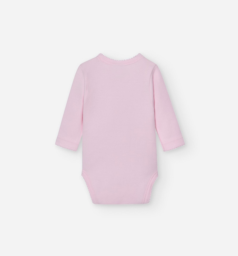 Omslagsbody fra Babidu i nydelig, lys rosa farge. Pen blondekant langs kanten. Trykknapper og behagelig stoff. 100% myk bomull.