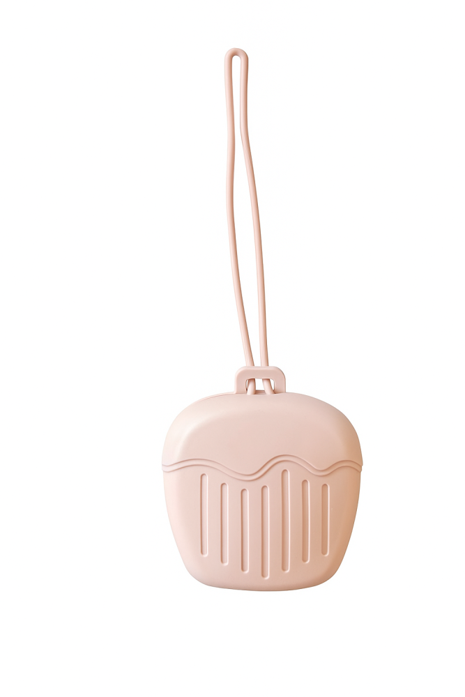 Smokkebeholder i 100% matgradsilikon. BPA-fri. Lang snor som kan festes rundt f.eks håndtak på vogn. Kan kokes eller vaskes i oppvaskmaskin. Tilgjengelig også i blå