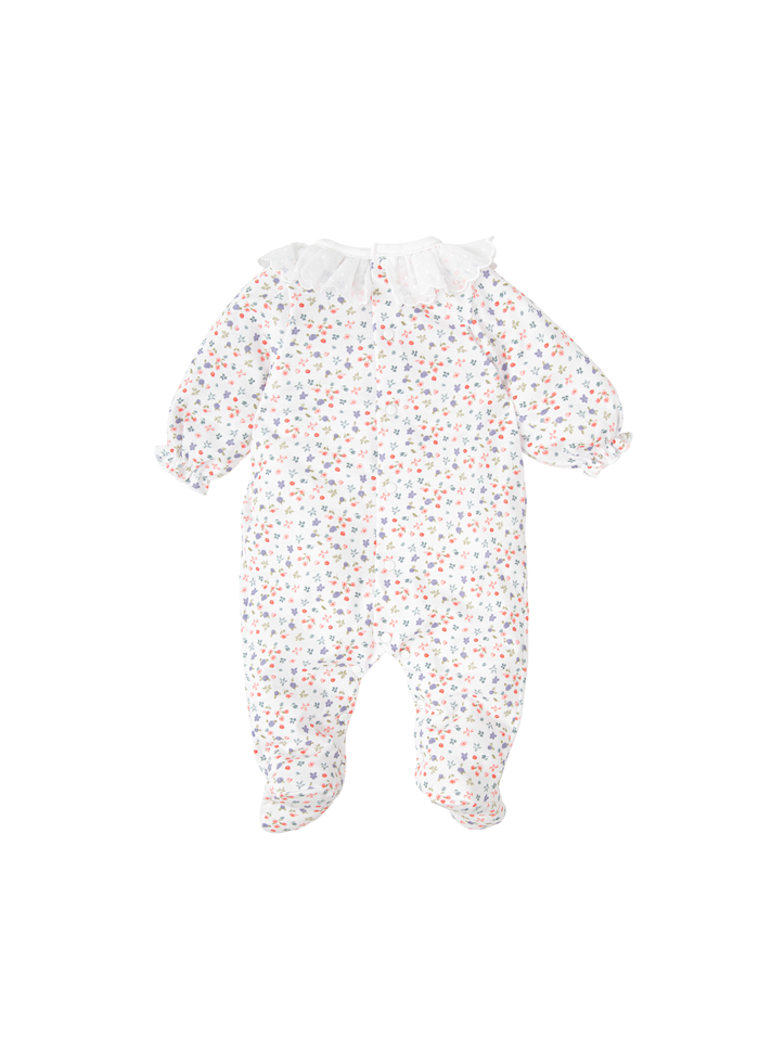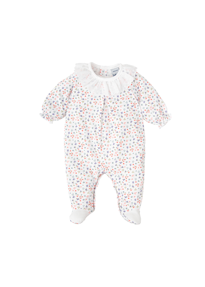 Heldress fra spanske Babidu. Blomstete helprint og med hvit ensfarget volangkrage. Trykknapper mellom beina og på ryggen. 100% myk bomull