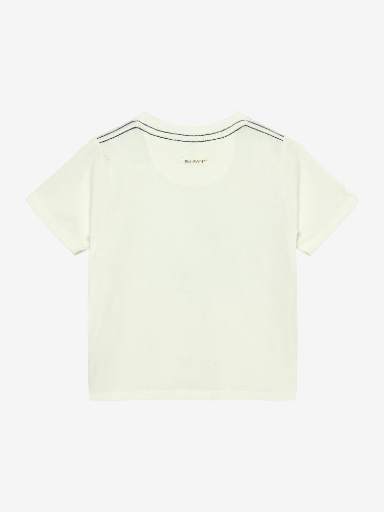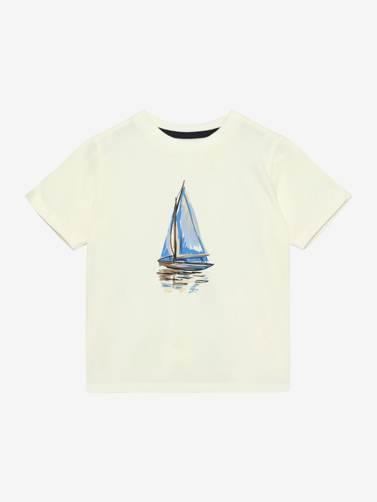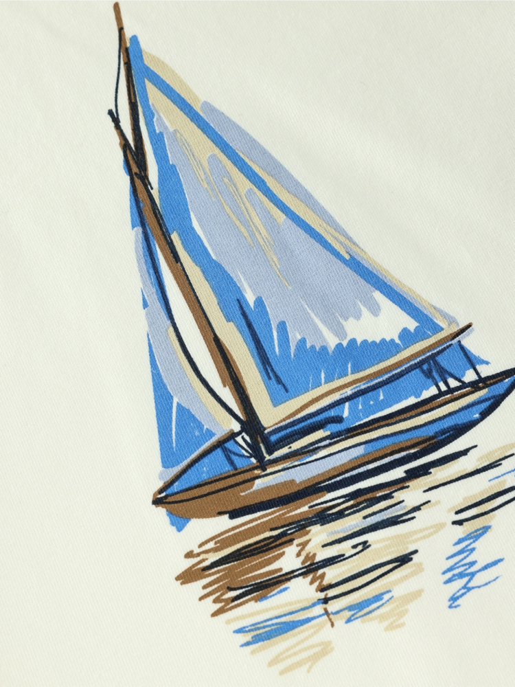 Myk t-skjorte med båtmotiv og korte ermer med oppbrett for en fin detalj. Laget i behagelig økologisk bomullsblanding og sertifisert etter GOTS (CERES-0366). Perfekt til både hverdag og lek.